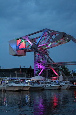 We walked into town to explore and found an ice cream shop with a patio in the back. It was so hot that we sat inside and enjoyed the air conditioning. Ashtabula is a tourist town, popular for it's many festivals. There was a small grassy courtyard between two buildings on the main street. Folks were relaxing on the lawn and listening to live music. We walked over the lift bridge to view our boats from the other side of the river. The locals were very friendly. We met many people fishing or just resting on the park benches next to our boat. Everyone wanted to hear our story and tell us theirs. One gal sat beside Mystic and told me all about the town including the history and the local gossip. She was waiting for the bridge to light up. We didn't know that the bridge lit up at night. Of course, I had to wait until dark to see it too. I sat watching that bridge for a long time, fascinated by the colors changing as the sky darkened! I took a lot of photos!